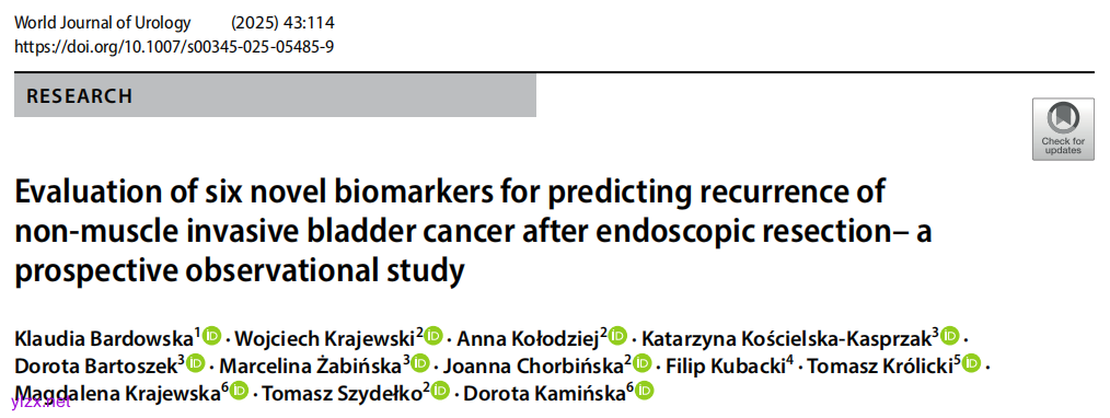 Bardowska K, Krajewski W, Kołodziej A, Kościelska-Kasprzak K, Bartoszek D, Żabińska M, Chorbińska J, Kubacki F, Królicki T, Krajewska M, Szydełko T, Kamińska D. Evaluation of six novel biomarkers for predicting recurrence of non-muscle invasive bladder cancer after endoscopic resection- a prospective observational study. World J Urol. 2025 Feb 10;43(1):114. doi: 10.1007/s00345-025-05485-9. PMID: 39928162; PMCID: PMC11811479.
