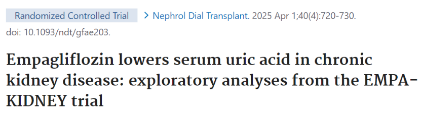 Mayne KJ, Sardell RJ, Staplin N, Judge PK, Zhu D, Sammons E, Cherney DZI, Green JB, Levin A, Pontremoli R, Hauske SJ, Emberson J, Preiss D, Landray MJ, Baigent C, Wanner C, Haynes R, Herrington WG; EMPA-KIDNEY Collaborative Group. Empagliflozin lowers serum uric acid in chronic kidney disease: exploratory analyses from the EMPA-KIDNEY trial. Nephrol Dial Transplant. 2025 Apr 1;40(4):720-730. doi: 10.1093/ndt/gfae203. PMID: 39277784; PMCID: PMC7616479.