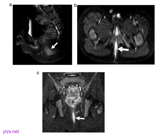 图 6岁男孩患有肛周克罗恩病。MRI脉冲序列包括(a)矢状面T2加权(T2W)快速自旋回波(FSE)脂肪饱和(FS), (b)轴向T2W FSE FS, (c)冠状面短tau反转恢复(STIR)。白色箭头显示后中线线状高信号异常,与肛周瘘一致。当使用Parks分类系统时,五位放射科医生将瘘管道描述为经括约肌,五位描述为括约肌间,三位描述为括约肌上