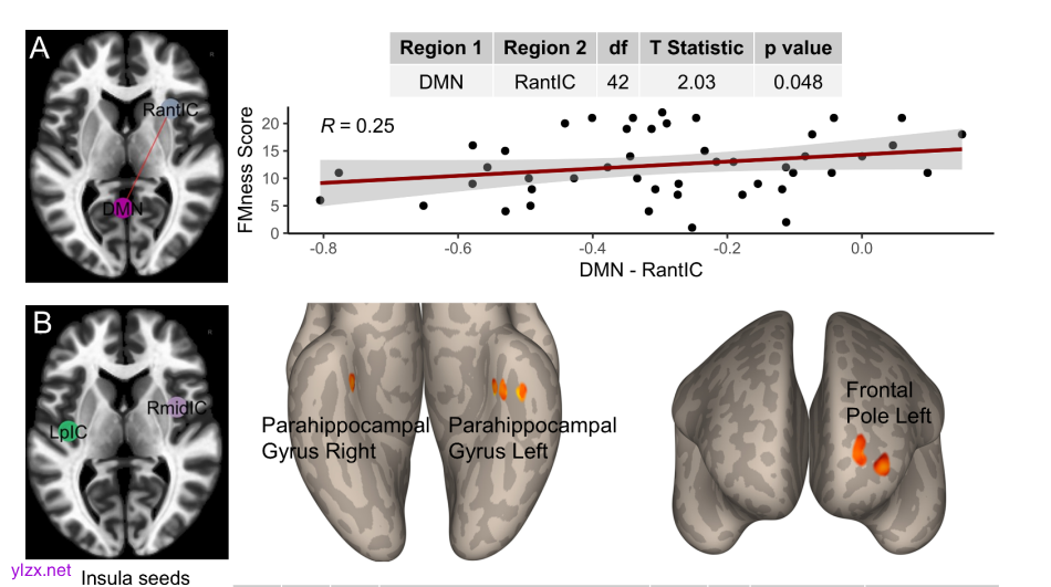 2. DMN-右中岛叶及左后岛叶连接增强:FMness评分与右中岛叶-左海马旁回(p=0.001)、右中岛叶-左额极(p=0.001)的功能连接正相关。