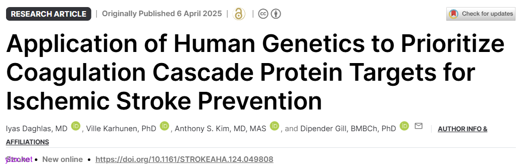 Daghlas I, Karhunen V, Kim AS, Gill D. Application of Human Genetics to Prioritize Coagulation Cascade Protein Targets for Ischemic Stroke Prevention. Stroke. 2025 Apr 6. doi: 10.1161/STROKEAHA.124.049808.