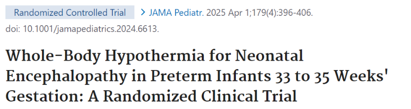 Whole-Body Hypothermia for Neonatal Encephalopathy in Preterm Infants 33 to 35 Weeks' Gestation: A Randomized Clinical Trial. JAMA Pediatr. 2025 Apr 1;179(4):396-406. doi: 10.1001/jamapediatrics.2024.6613. PMID: 39992674; PMCID: PMC11851295.