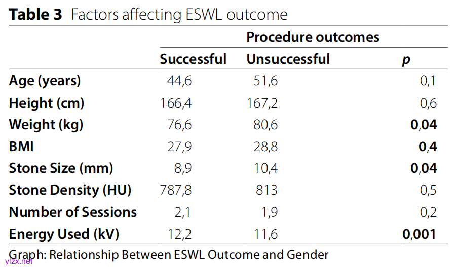 结果显示,男性手术成功率为66%,女性为78%,性别差异无统计学意义(p > 0.05)。两组结石位置相似。A组成功率为66%,B组为74%,差异无显著性(p > 0.05)。成功手术的患者平均体重为76.6kg,结石大小为8.9mm,总能量为12.2kV,与不成功手术相比差异有显著性(分别p < 0.04,p < 0.04,p < 0.001)。在年龄、身高、体重指数(BMI)、结石密度(HU)和治疗次数方面,A组和B组之间无显著差异(p > 0.05)。