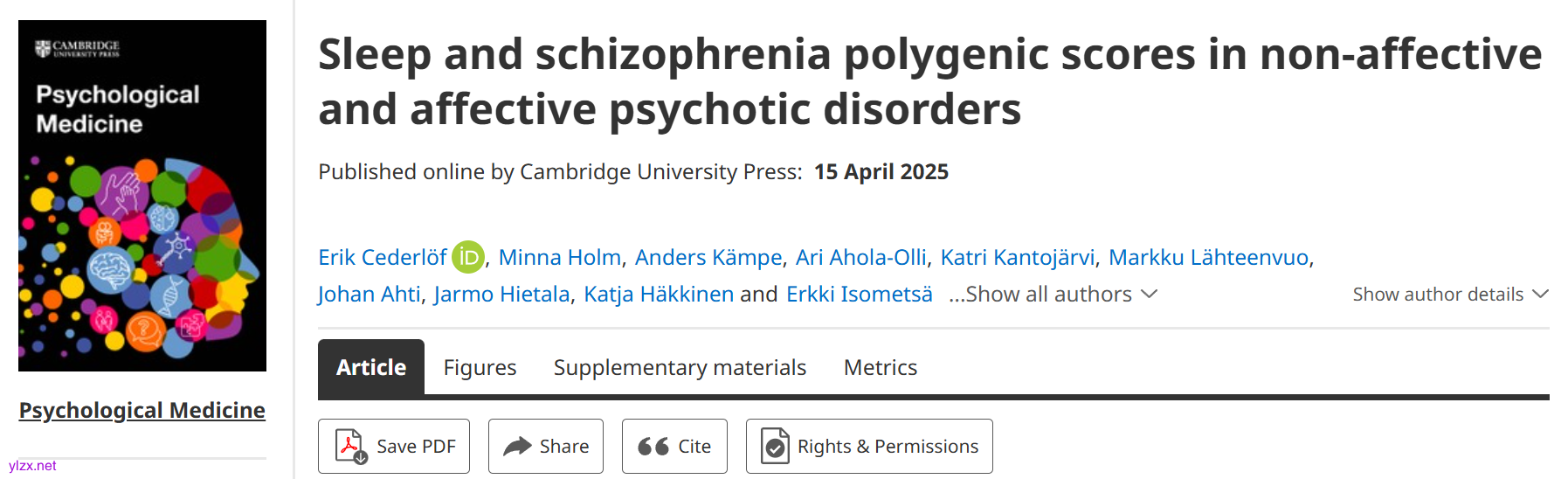 Cederlöf, E., Holm, M., Kämpe, A., et al. (2025). Sleep and schizophrenia polygenic scores in non-affective and affective psychotic disorders. *Psychological Medicine, 55*, e117. https://doi.org/10.1017/S0033291725000844