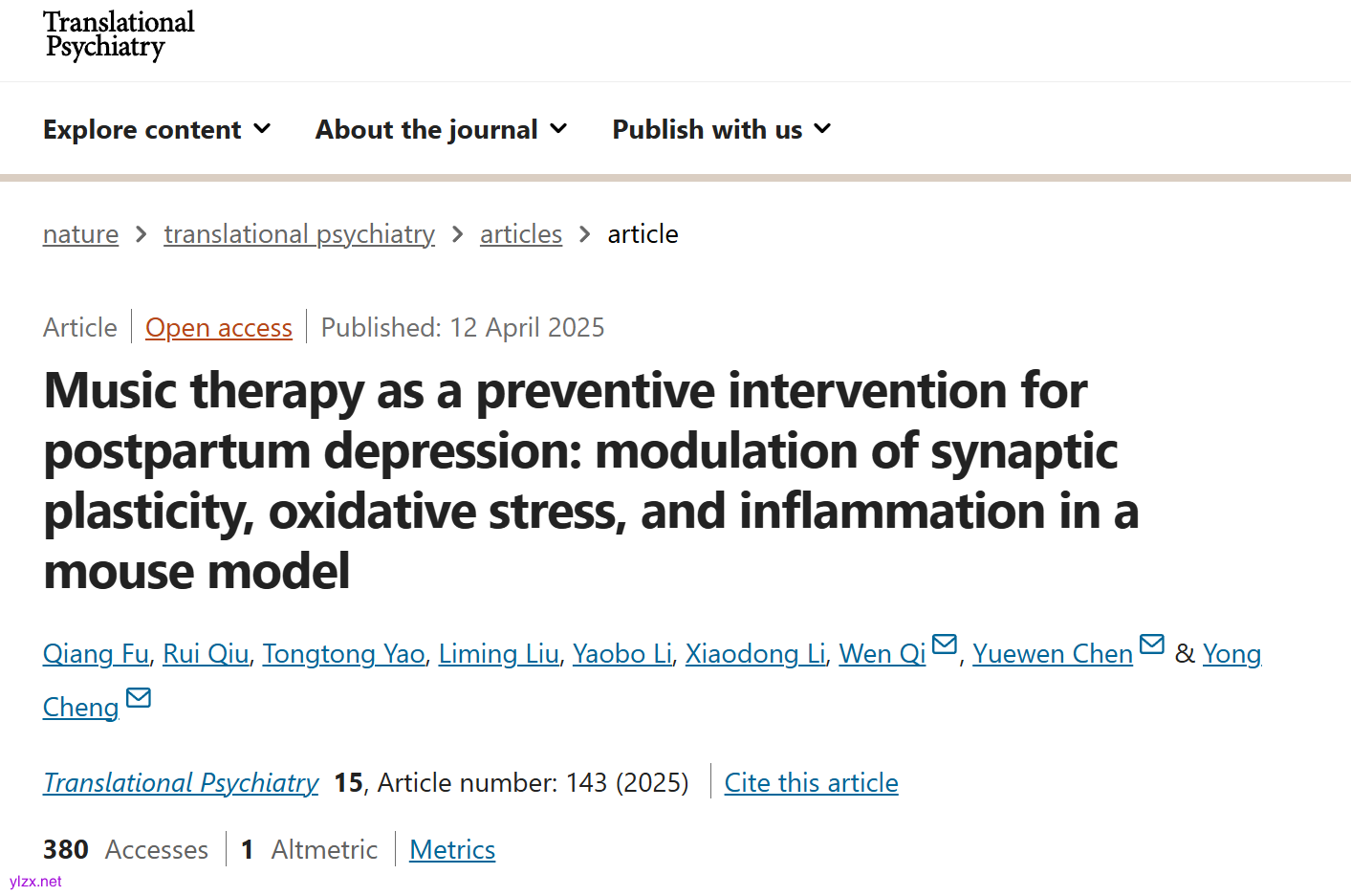 Fu, Q., Qiu, R., Yao, T., Liu, L., Li, Y., Li, X., Qi, W., & Cheng, Y. (2025). Music therapy as a preventive intervention for postpartum depression: modulation of synaptic plasticity, oxidative stress, and inflammation in a mouse model. *Translational Psychiatry, 15*(143). https://doi.org/10.1038/s41398-025-03370-y