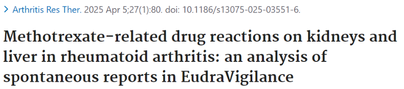 Khoroshun K, Bantel C, Hoffmann F, Jobski K. Methotrexate-related drug reactions on kidneys and liver in rheumatoid arthritis: an analysis of spontaneous reports in EudraVigilance. Arthritis Res Ther. 2025 Apr 5;27(1):80. doi: 10.1186/s13075-025-03551-6. PMID: 40188149; PMCID: PMC11972469.