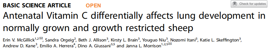 Erin V. McGillick, Sandra Orgeig, et al, Antenatal Vitamin C differentially affects lung development in normally grown and growth restricted sheep, Pediatric Research, 2025, https://doi.org/10.1038/s41390-025-03828-1.