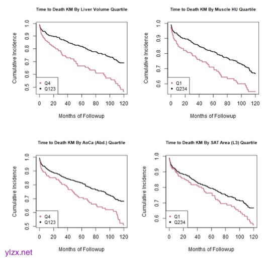 图 死亡时间图比较最高风险四分位数与其他四分位数的自动CT生物标志物肝体积、L3骨骼肌密度、腹主动脉Agatston评分和L3皮下脂肪面积