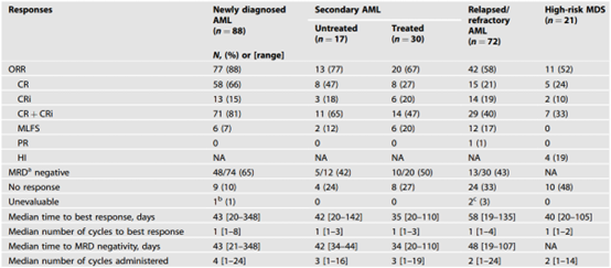 研究共纳入228例患者,直至数据截止日期(2022年12月)。其中,135例(59%)为未经治疗的AML患者(88例为新诊断,47例为继发性AML),72例(32%)为R/R AML,21例(9%)为高危MDS患者。中位随访时间为39个月,中位年龄为72岁。在新诊断的AML患者中,ORR为88%,其中CR+CRi率为81%。在未经治疗的继发性AML患者中,ORR为77%,CR+CRi率为65%;在接受过治疗的继发性AML患者中,ORR为67%,CR+CRi率为47%。高危MDS患者的ORR为52%。值得注意的是,15例接受FLT3抑制剂联合治疗的患者中有15例(88%)获得响应,显示出较高的反应率。