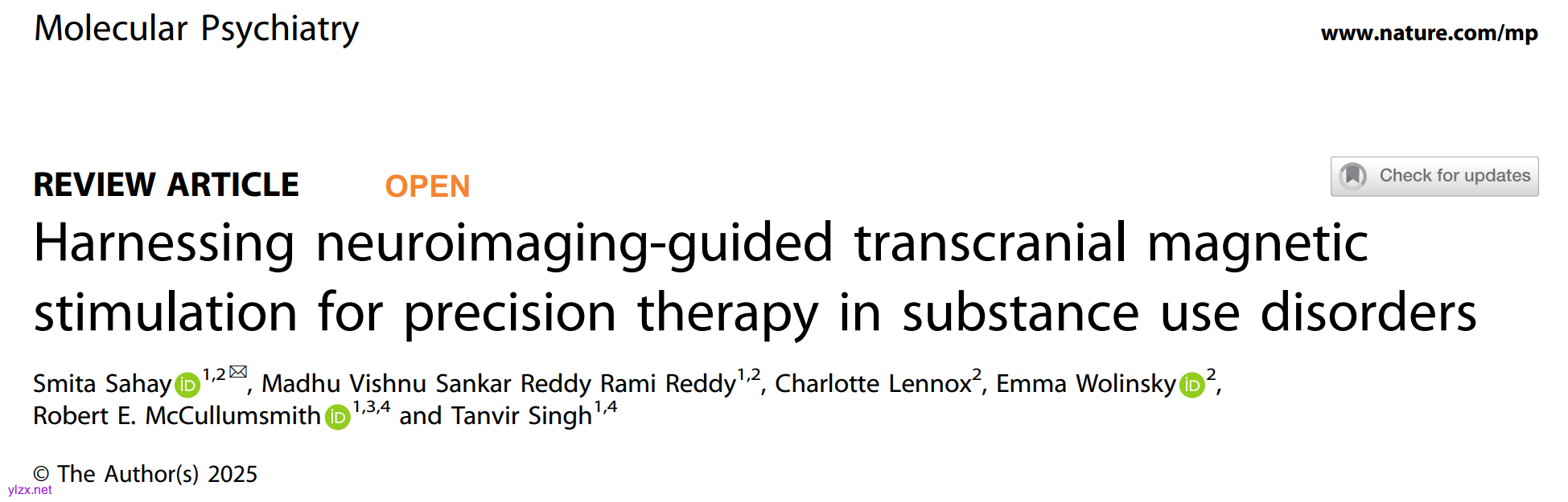 Sahay, S., Reddy, M. V. S. R., Lennox, C., Wolinsky, E., McCullumsmith, R. E., & Singh, T. (2025). Harnessing neuroimaging-guided transcranial magnetic stimulation for precision therapy in substance use disorders. *Molecular Psychiatry*. https://doi.org/10.1038/s41380-025-03024-x