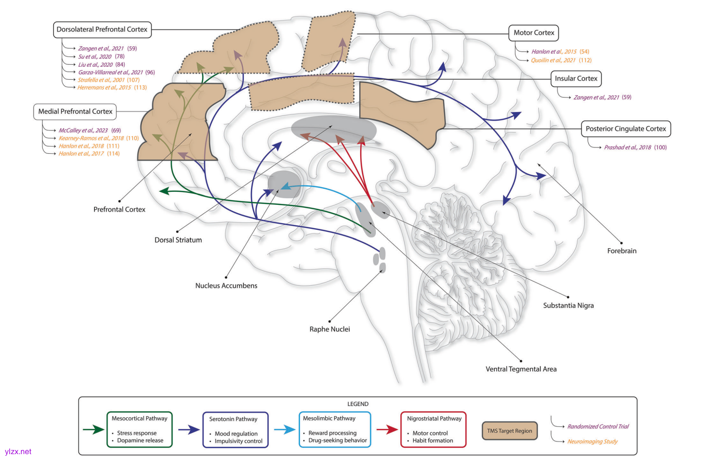 图1:SUDs中受影响的皮质通路及TMS靶向脑区