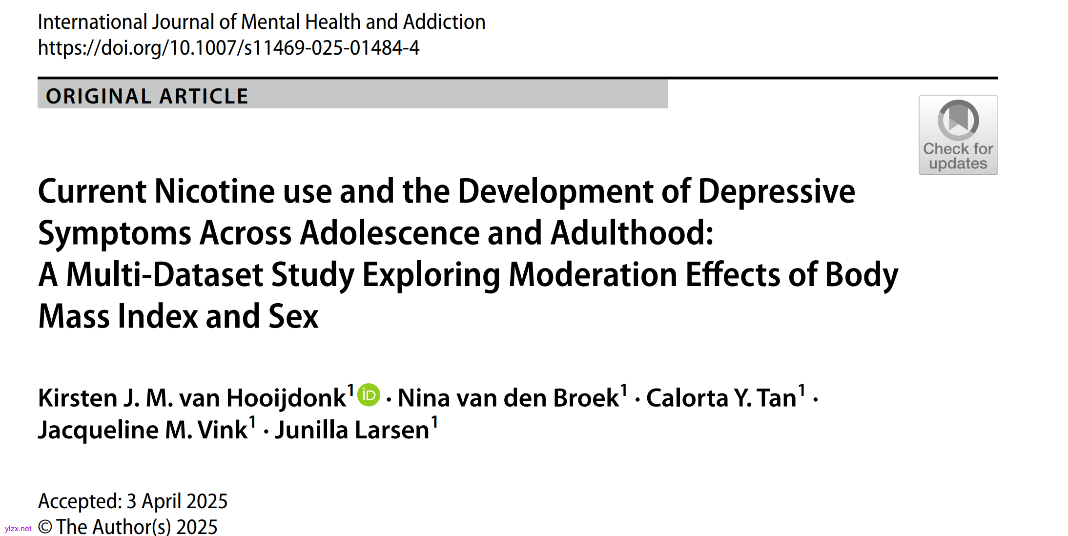 van Hooijdonk, K. J. M., van den Broek, N., Tan, C. Y., Vink, J. M., & Larsen, J. (2025). Current nicotine use and the development of depressive symptoms across adolescence and adulthood: A multi-dataset study exploring moderation effects of body mass index and sex. International Journal of Mental Health and Addiction. https://doi.org/10.1007/s11469-025-01484-4