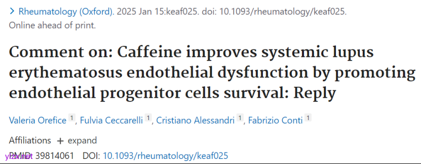 Orefice V, Ceccarelli F, Alessandri C, Conti F. Comment on: Caffeine improves systemic lupus erythematosus endothelial dysfunction by promoting endothelial progenitor cells survival: Reply. Rheumatology (Oxford). 2025 Jan 15:keaf025. doi: 10.1093/rheumatology/keaf025. Epub ahead of print. PMID: 39814061.