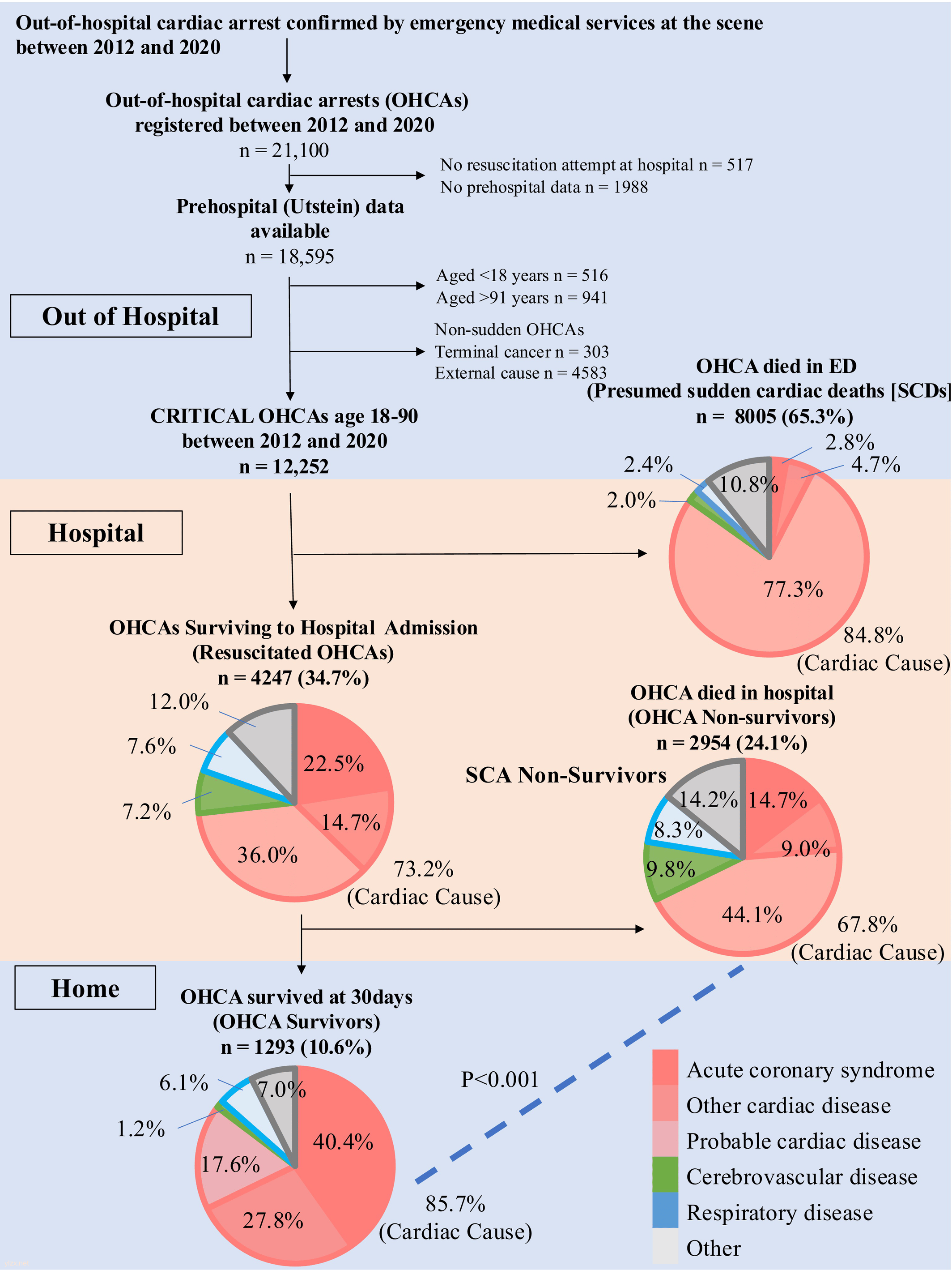 研究人员纳入了2012年7月1日至2020年12月31日期间年龄在18至90岁的OHCA(根据CARES[心脏骤停登记处提高生存]标准)非创伤性患者。根据日本法律,所有OHCA患者(复苏与否)必须被送往急诊室,如果复苏失败,则宣布死亡;而那些存活到住院的人被认为是复苏的OHCA。研究人员比较了假定的心源性猝死、心源性猝死幸存者(事件发生后30天存活)和非心源性猝死幸存者(住院期间死亡)的潜在病因。死因在尸检或复苏后的医院检查中得到确认,在主治医生的印象(部分检查)中确定可能的原因。