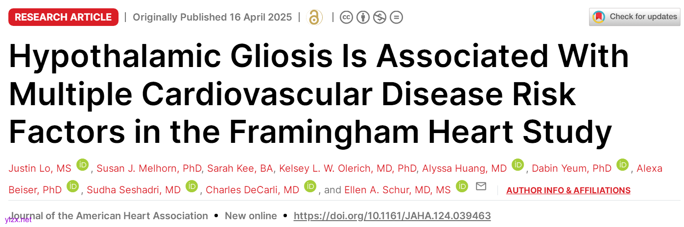 Justin Lo,et al.Hypothalamic Gliosis Is Associated With Multiple Cardiovascular Disease Risk Factors in the Framingham Heart Study.JAHA.2025.https://www.ahajournals.org/doi/full/10.1161/JAHA.124.039463