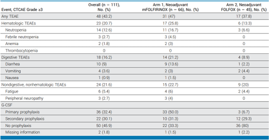 在意向治疗(ITT)人群中,mFOLFIRINOX组有70.8%的患者完成了整个治疗序列,而FOLFOX组和对照组分别为68%和50%。在随机分组后的12个月内,mFOLFIRINOX组、FOLFOX组和对照组的存活率分别为84.3%、71.4%和82.1%。mFOLFIRINOX组的一年无事件生存率(EFS)为51.4%,中位EFS为12.4个月;FOLFOX组的一年EFS为43.1%,中位EFS为11.0个月;对照组的一年EFS为38.7%,中位EFS为6.8个月。