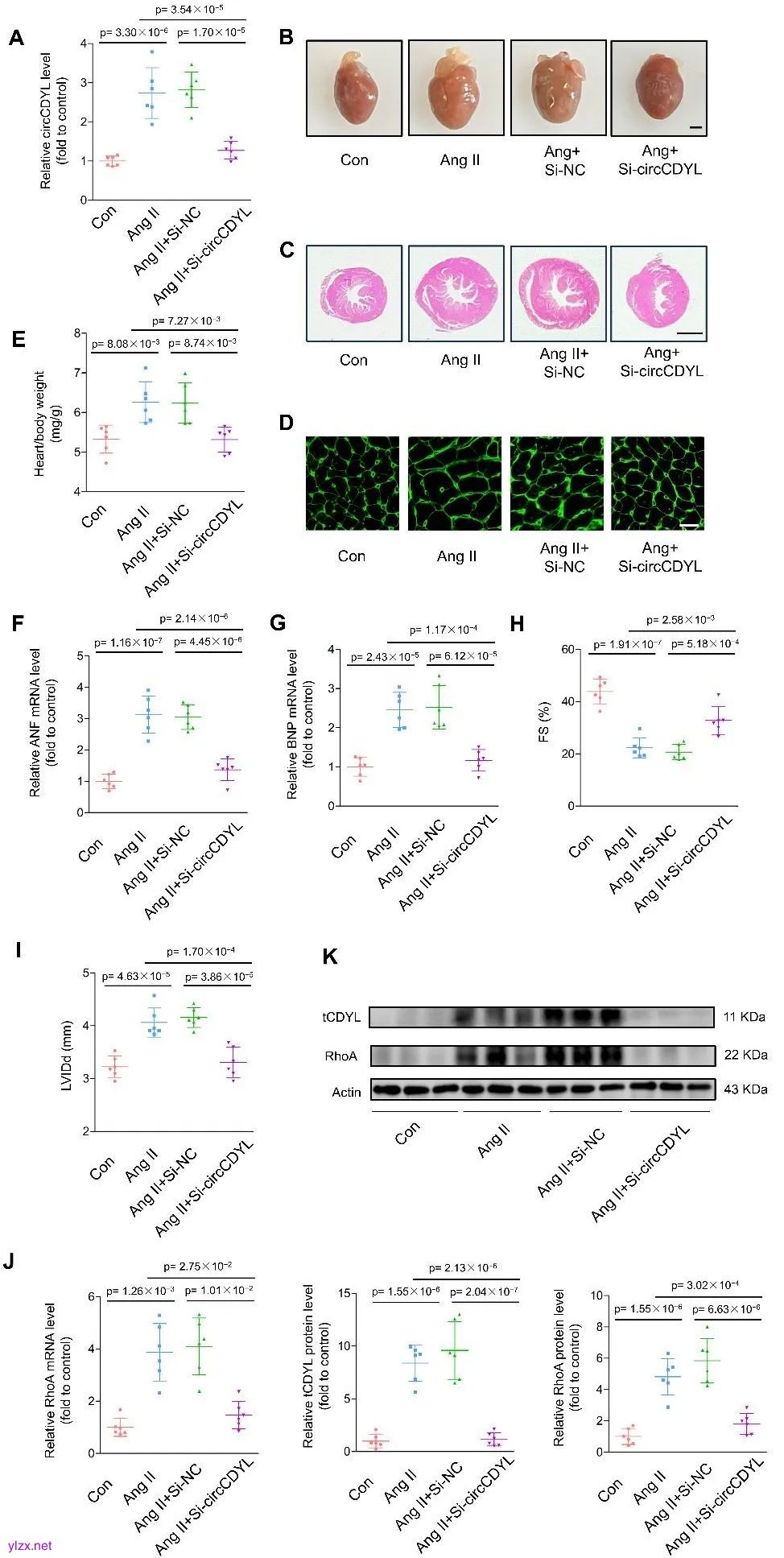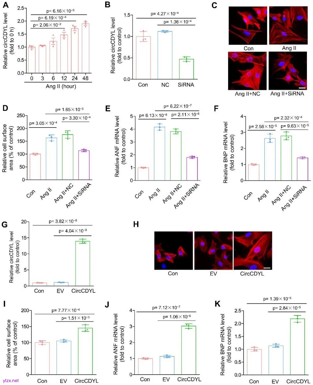 为了探索circCDYL在病理性心肌肥大中的功能,研究利用血管紧张素-II在体外诱导大鼠原代心肌细胞肥大,并观察到circCDYL在心肌细胞中的表达水平随血管紧张素-II刺激时间的延长而增长。进一步在心肌细胞中沉默内源性circCDYL可显著减轻由血管紧张素-II导致的心肌细胞表面积增大以及心肌肥大标志物ANF和BNP表达的升高,而在心肌细胞中过表达circCDYL则能够直接造成心肌细胞肥大表型。