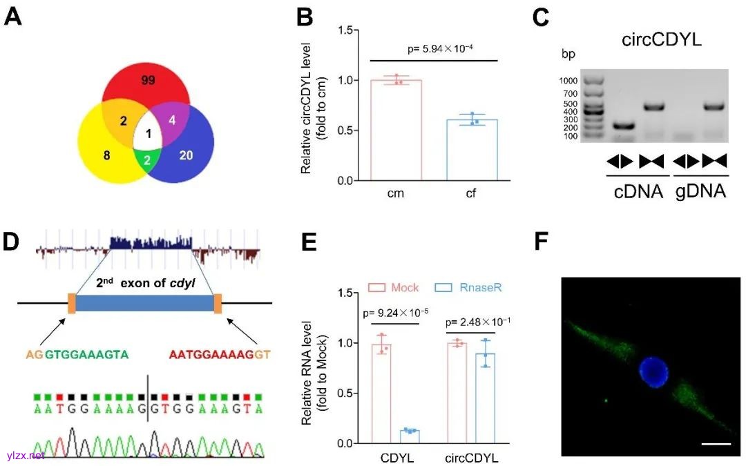 该研究首先从心脏高通量环形RNA测序数据中筛选出了在心脏中高表达、物种间高保守以及在压力过载刺激下表达显著改变的三个环形RNA合集,将同时存在于三个合集中的circCDYL作为潜在的病理性心肌肥大相关环形RNA进行研究。CircCDYL由cdyl基因长660 nt的2号外显子通过反向剪接生成,主要表达、定位于心肌细胞的细胞质中。