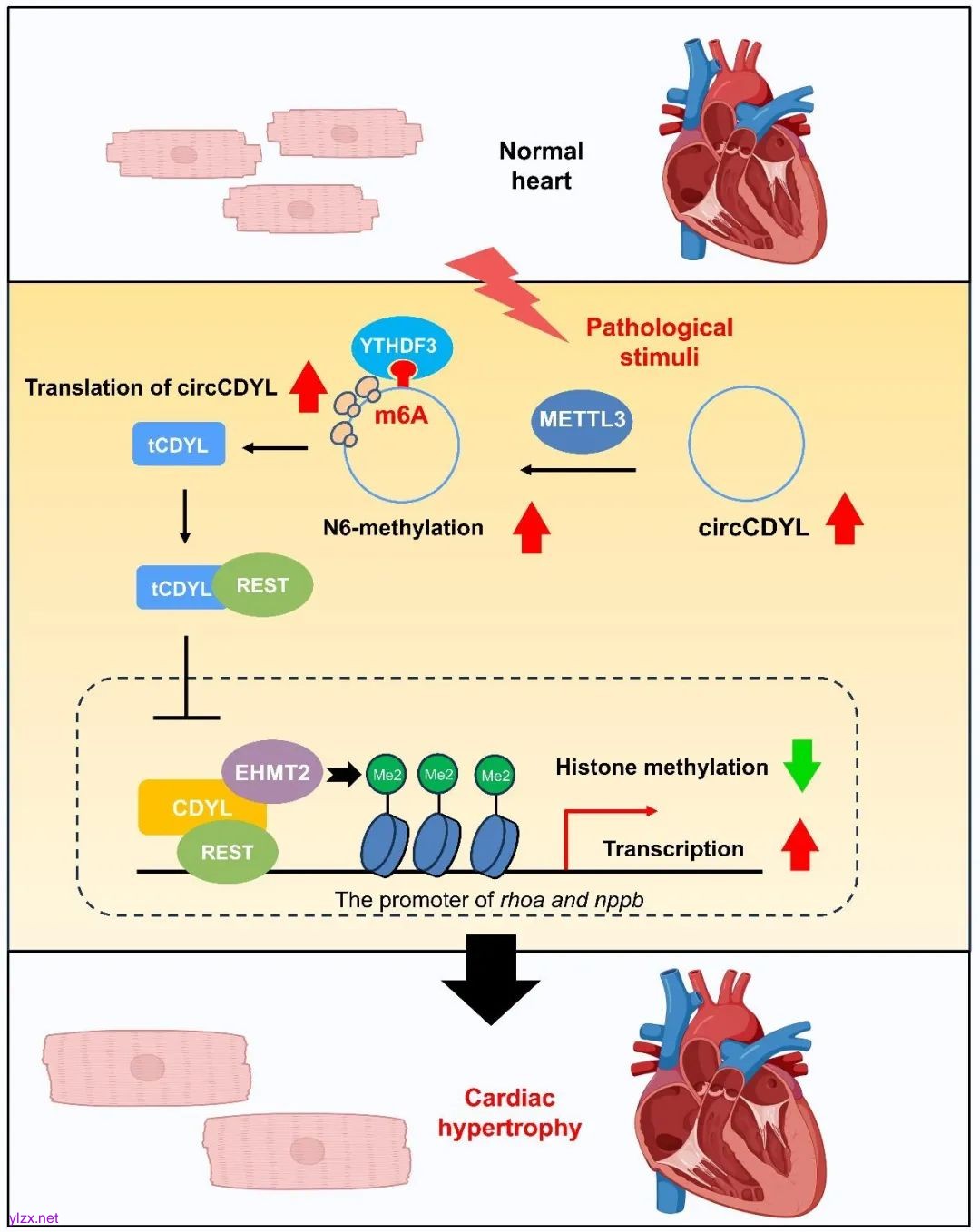 机制上,circCDYL并不能作为典型的miRNA海绵或蛋白支架发挥作用。研究者发现circCDYL序列中存在一个保守的潜在ORF,可能编码一条长度为100 aa的多肽-tCDYL-100,其序列与CDYL (Chromodomain Y-like)蛋白高度重合。为了验证circCDYL能否编码tCDYL-100,研究者对circCDYL表达载体进行改造,在该潜在ORF终止密码子前融合了Flag-tag编码序列。利用Flag抗体可通过免疫印迹在转染此改造载体的细胞中检测到与推定的Flag-tCDYL-100分子量一致的蛋白的表达,同时通过质谱分析从对应的蛋白条带中鉴定出tCDYL的肽段。而突变ORF中的起始密码子后则无法检测到此蛋白的表达。研究者还制备了tCDYL-100多克隆抗体,通过免疫印迹在心肌细胞中检测到了内源性tCDYL-100的表达,而且tCDYL-100的表达量在转染circCDYL表达载体后显著提升,由此证明了circCDYL在心肌细胞中可翻译生成tCDYL-100。研究进一步发现,circCDYL的翻译过程受m6A修饰调控:心肌细胞受到病理刺激后circCDYL发生m6A修饰,成为翻译模板,在YTHDF3介导下激活tCDYL-100的表达。当突变起始密码子上游保守的m6A修饰位点或以m6A抑制剂环亮氨酸处理细胞后,tCDYL-100表达受到显著抑制。tCDYL-100定位于心肌细胞的细胞质中,通过与CDYL竞争结合转录共抑制因子REST (RE1-silencing transcription factor),阻止REST进入细胞核以及REST-CDYL-EHMT2 (Euchromatic histone-lysine N-methyltransferase 2)复合物的形成,最终导致促心肌肥大相关基因rhoa和nppb启动子区域H3K9甲基化修饰水平的降低,从而激活基因的转录。