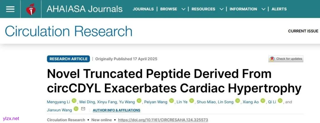 2025年4月17日,青岛大学王建勋团队在国际学术期刊Circulation Research上以Research Article形式发表了题为“Novel Truncated Peptide Derived From circCDYL Exacerbates Cardiac Hypertrophy”的研究成果,揭示了心脏环形RNA-circCDYL在诱导病理性心肌肥大发病中的关键调控作用。