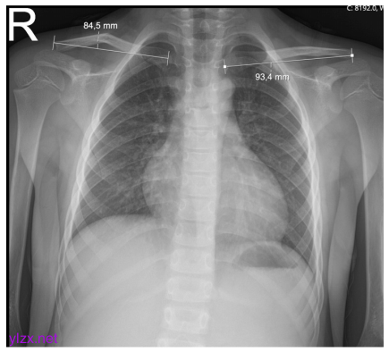 锁骨缩短测量示例。缩短量是通过从对侧未受伤锁骨的长度中减去骨折锁骨的长度(93.4-84.5=8.9 mm)来测量的。缩短百分比是通过将缩短量除以对侧未受伤锁骨的长度来确定的(8.9/93.4 x 100=9.53%)。