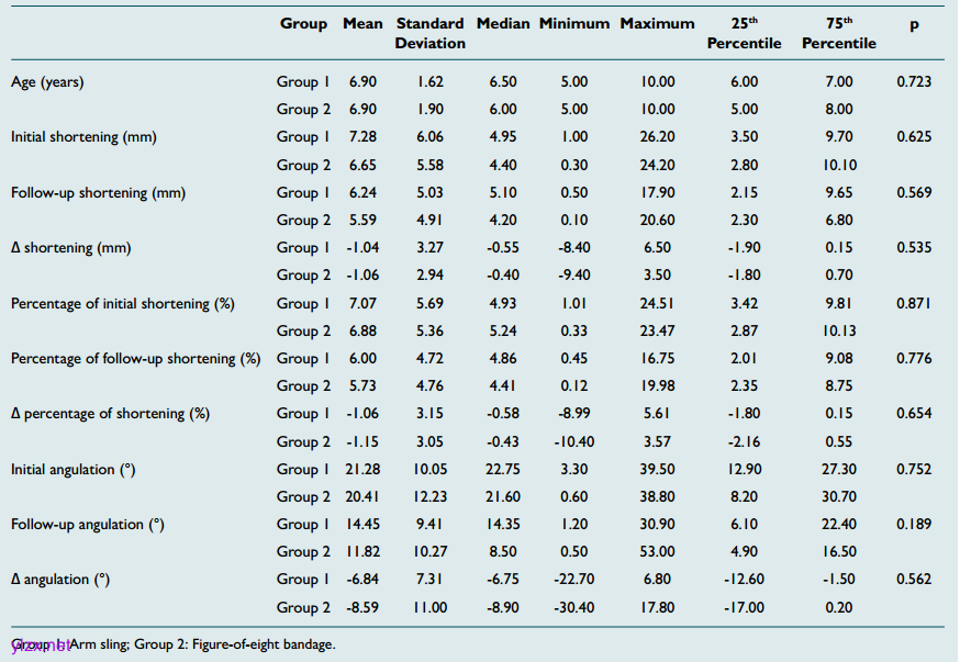 方法:根据患者偏好的保守治疗方法将其分为两组:第1组(手臂吊带组)和第2组(“8”字绷带组)。在初次就诊时和随访期间测量骨折的成角程度和短缩程度。比较两组患者的人口统计学特征和影像学数据。