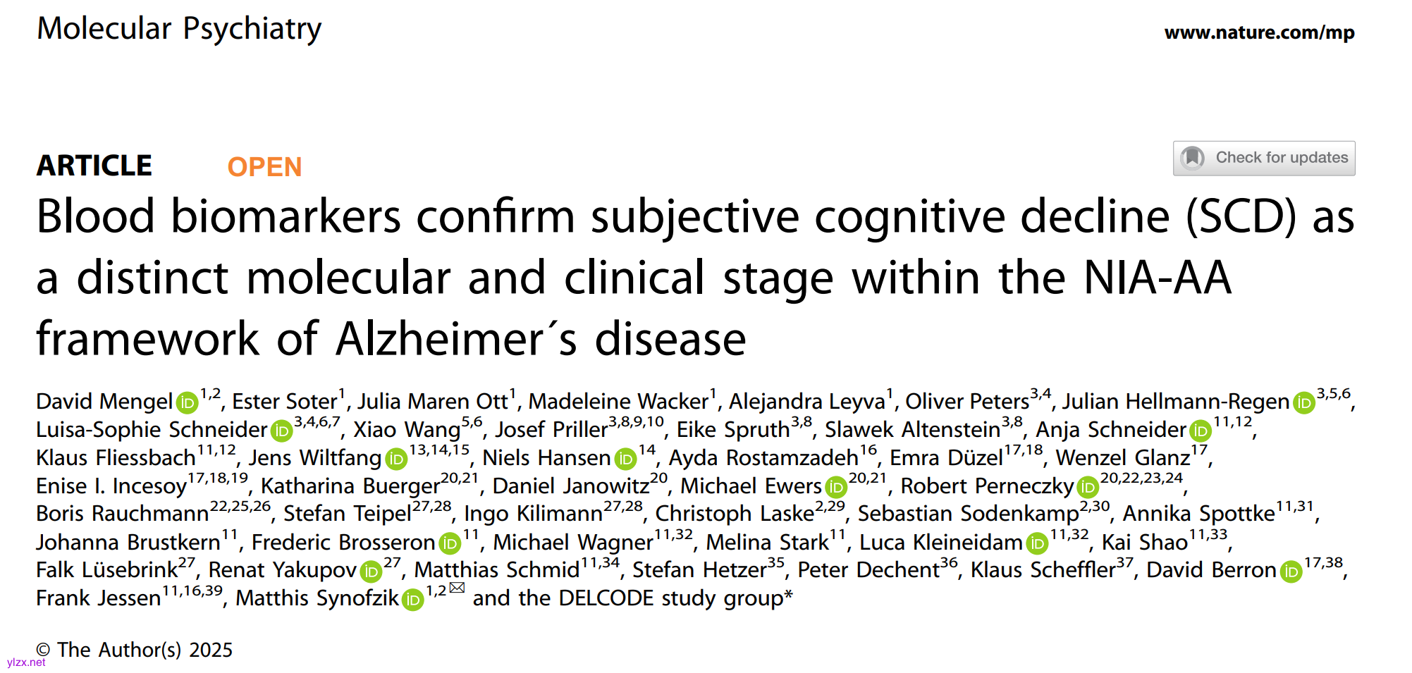 Mengel, D., Soter, E., Ott, J. M., et al. (2025). Blood biomarkers confirm subjective cognitive decline (SCD) as a distinct molecular and clinical stage within the NIA-AA framework of Alzheimer’s disease. *Molecular Psychiatry*. https://doi.org/10.1038/s41380-025-03021-0
