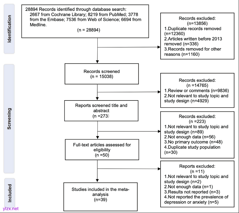 本次荟萃分析遵循系统综述和荟萃分析优先报告的条目(PRISMA指南)进行,研究方案已在PROSPERO(CRD42023484984)注册。研究通过在PubMed、Web of Science、Cochrane Library、MEDLINE和Embase数据库中搜索了2013年至2024年间发表的相关文章,以确定CVD患者中抑郁症的全球患病率。经检索和筛选,最终共纳入39项研究,涵盖63,444例心血管疾病患者,其中12,308人被诊断为抑郁症。