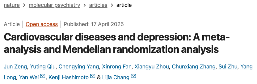 Zeng, J., Qiu, Y., Yang, C. et al. Cardiovascular diseases and depression: A meta-analysis and Mendelian randomization analysis. Mol Psychiatry (2025). https://doi.org/10.1038/s41380-025-03003-2