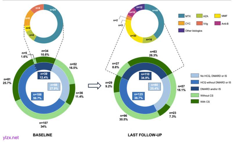 在初次确诊时,52名患者(16.5%)未接受治疗,224人(71.1%)接受了HCQ和/或GC,39人(12.4%)接受了DMARDs和/或IS。随访过程中,仅有10名患者(3.2%)始终未接受治疗,而77人(24.4%)在随访期内实现GC停药。