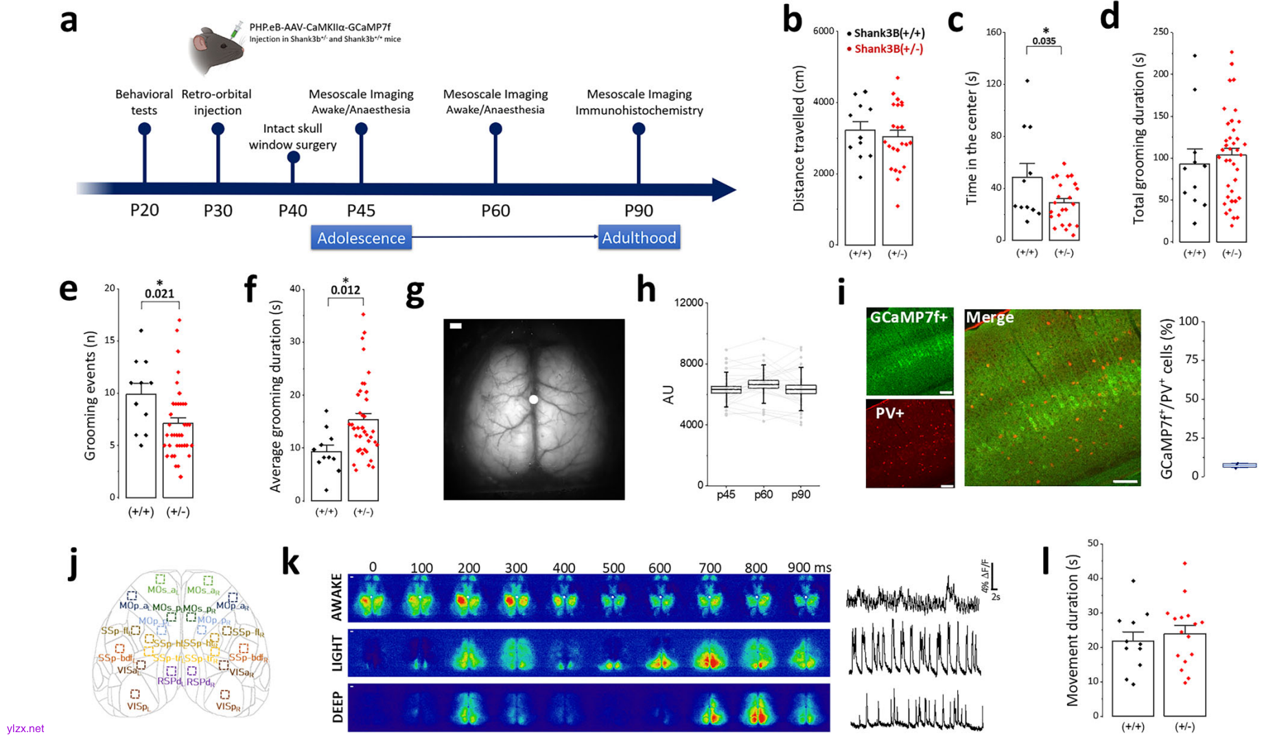图1:皮层介观钙成像实验设计、免疫组化分析和Shank3b+/−小鼠行为特征