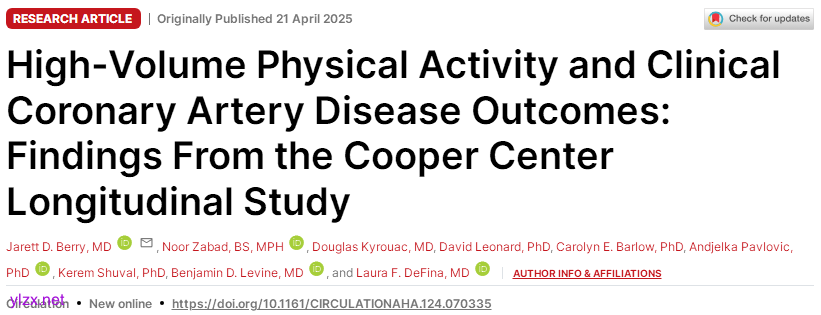 Jarett D. Berry,et al.High-Volume Physical Activity and Clinical Coronary Artery Disease Outcomes: Findings From the Cooper Center Longitudinal Study.Circulation.2025.https://www.ahajournals.org/doi/full/10.1161/CIRCULATIONAHA.124.070335
