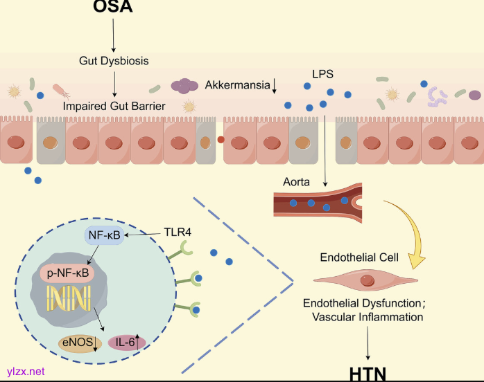 这项研究首次在动物模型中证实,来自OSA患者的肠道菌群可通过肠源性LPS激活TLR4/NF-κB炎症通路,诱导血管损伤及血压升高,构成了OSA与高血压之间的关键分子桥梁。