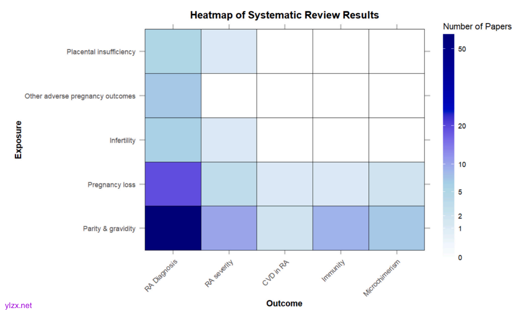 妊娠相关暴露因素与类风湿关节炎结局的研究分布热力图