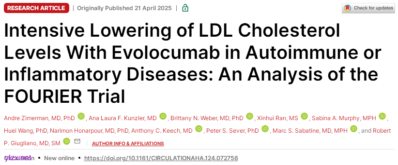 Andre Zimerman,et al.Intensive Lowering of LDL Cholesterol Levels With Evolocumab in Autoimmune or Inflammatory Diseases: An Analysis of the FOURIER Trial.Circulation.2025.https://www.ahajournals.org/doi/full/10.1161/CIRCULATIONAHA.124.072756