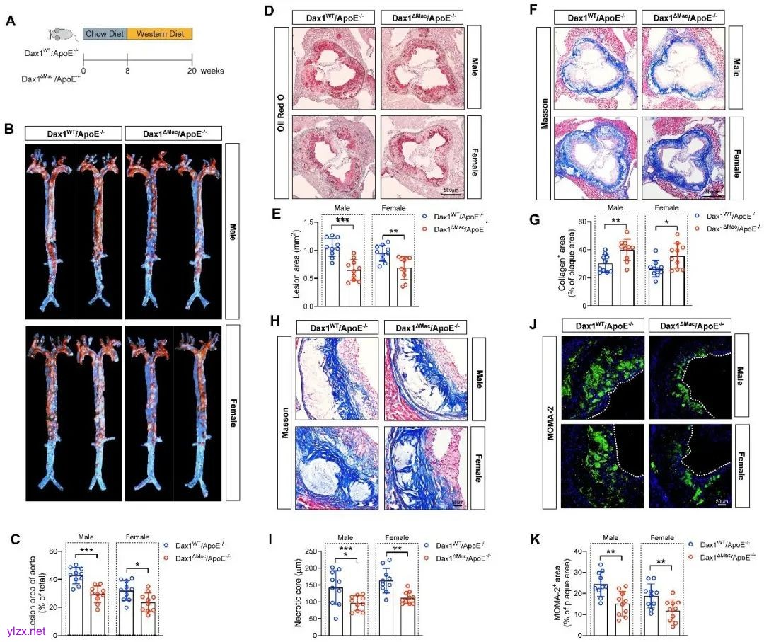 研究团队通过比较动脉粥样硬化与非动脉粥样硬化血管组织中的核受体表达谱,发现NR0B1(编码Dax1的基因)在动脉粥样硬化组织中的表达显著上调。组织学免疫染色显示,Dax1主要在动脉粥样硬化斑块中的巨噬细胞内表达。为了探究Dax1在动脉粥样硬化中的作用,研究者构建了巨噬细胞Dax1特异性敲除(Dax1ΔMac)动脉粥样硬化小鼠模型(AAV8-PCSK9造模),以及巨噬细胞Dax1与ApoE的双基因敲除(Dax1ΔMac/ApoE-/-)动脉粥样硬化小鼠模型。结果显示,巨噬细胞Dax1缺失能显著减轻主动脉斑块面积,改善斑块稳定性。