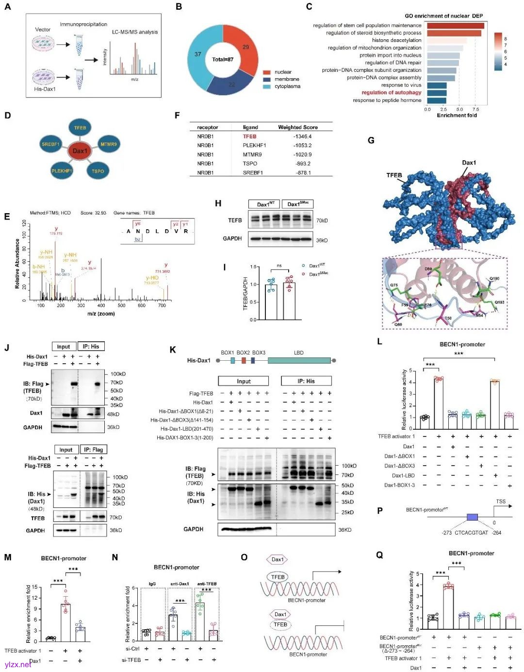 研究还发现,Dax1敲除的巨噬细胞自噬水平增加。研究者利用免疫沉淀联合质谱分析,鉴定到参与自噬调控的关键转录因子TFEB为Dax1的互作蛋白。通过截短突变实验,确认Dax1的BOX2结构域是其与TFEB结合的关键区域。上述结果表明,Dax1通过抑制巨噬细胞自噬和胆固醇转运,促进泡沫细胞形成,诱导动脉粥样硬化的发生,提示Dax1可能成为潜在治疗靶点。