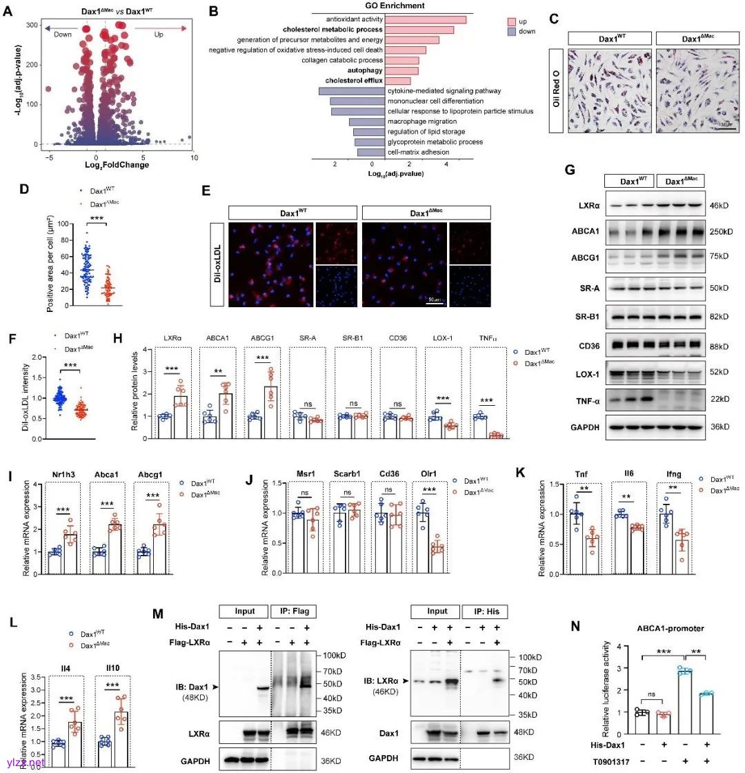 为了阐明Dax1促进动脉粥样硬化的机制,研究者对Dax1ΔMac小鼠和对照组(Dax1WT)小鼠的腹腔巨噬细胞进行了RNA测序。GO分析显示,差异基因在自噬和胆固醇代谢相关通路中富集。体外实验结果表明,Dax1敲除的巨噬细胞中脂质沉积减少,胆固醇转运相关蛋白ABCA1/G1的表达增加,炎症因子TNF-α水平降低。免疫共沉淀和双荧光报告基因实验证实Dax1可与肝X受体α(LXRα)结合,并抑制LXRα靶基因ABCA1的转录活性。结合文献报道,该研究确认了Dax1作为共抑制因子,损害LXRα介导的胆固醇转运。