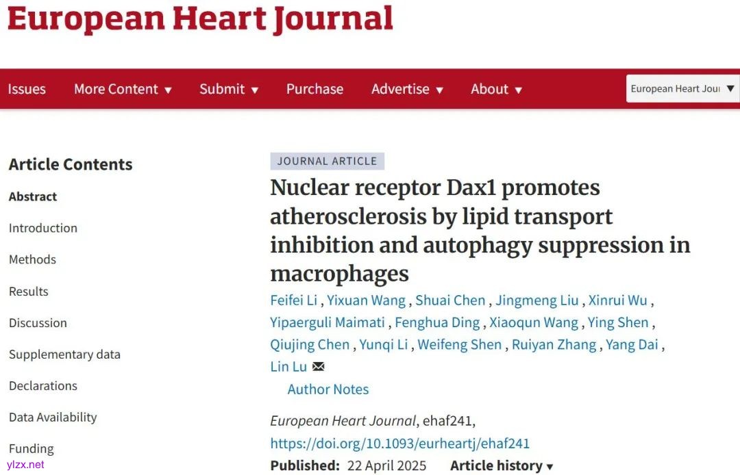 2025年4月22日,上海交通大学医学院心血管病研究所/瑞金医院心内科陆林/代杨团队在European Heart Journal杂志在线发表题为“Nuclear receptor Dax1 promotes atherosclerosis by lipid transport inhibition and autophagy suppression in macrophages”的研究论文,揭示了巨噬细胞核受体Dax1在动脉粥样硬化中的关键调控作用。