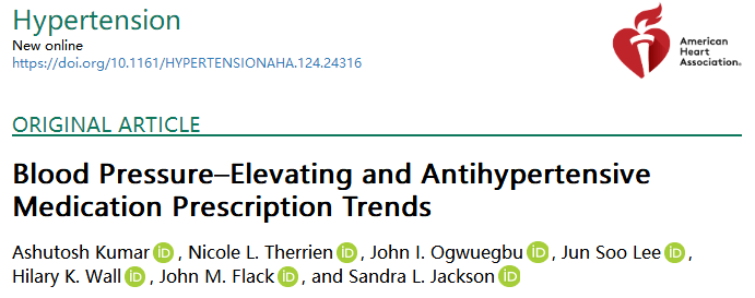 Ashutosh Kumar,et al.Blood Pressure–Elevating and Antihypertensive Medication Prescription Trends.Hypertension.2025.https://www.ahajournals.org/doi/full/10.1161/HYPERTENSIONAHA.124.24316