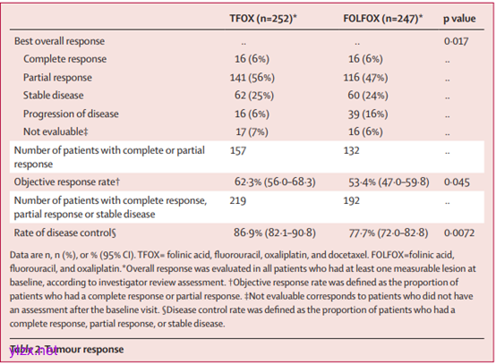 PRODIGE 51-FFCD-GASTFOX是一项开放标签、多中心、随机、III期试验,在法国的96个医疗中心进行。符合条件的患者年龄≥18岁,经组织学证实为HER2阴性的胃或胃食管交界部腺癌,局部晚期不可切除或转移性,既往未接受过晚期癌症治疗,根据RECIST 1.1标准有可测量病灶,ECOG体能状态评分为0或1,器官功能良好。患者按1:1比例随机分配接受FOLFOX或TFOX治疗,随机化分层因素包括中心、ECOG体能状态、(新)辅助化疗或放化疗、肿瘤分期、肿瘤位置和病理组织学亚型。FOLFOX组每2周接受一次亚叶酸钙400 mg/m²、奥沙利铂85 mg/m²和5-氟尿嘧啶400 mg/m²推注,随后5-氟尿嘧啶2400 mg/m²持续46小时输注。TFOX组每2周接受一次多西他赛50 mg/m²、亚叶酸钙400 mg/m²和奥沙利铂85 mg/m²,随后5-氟尿嘧啶2400 mg/m²持续46小时输注。治疗持续至疾病进展、不可接受的毒性、研究者决定或患者拒绝治疗。研究的主要终点为无进展生存期(PFS),次要终点包括总生存期(OS)和客观缓解率(ORR)。