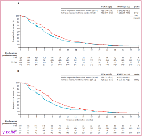 从2016年12月19日至2022年12月26日,共507例患者被随机分配至TFOX组(254例)和FOLFOX组(253例)。中位随访时间为42.8个月。TFOX组的中位无进展生存期(PFS)为7.59个月,FOLFOX组为5.98个月(HR 0.76,95% CI 0.62-0.93;p=0.0072)。TFOX组的中位总生存期(OS)为15.08个月,FOLFOX组为12.65个月(HR 0.82,95% CI 0.68-0.99;p=0.048)。TFOX组的客观缓解率(ORR)为62.3%,FOLFOX组为53.4%(p=0.045)。