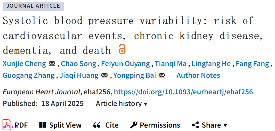 Xunjie Cheng,et al.Systolic blood pressure variability: risk of cardiovascular events, chronic kidney disease, dementia, and death.European Heart Journal.2025.https://academic.oup.com/eurheartj/advance-article/doi/10.1093/eurheartj/ehaf256/8116062