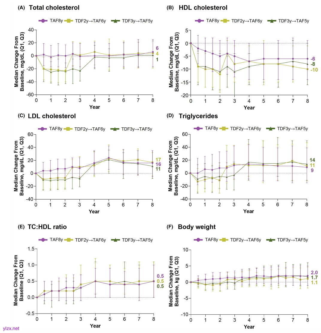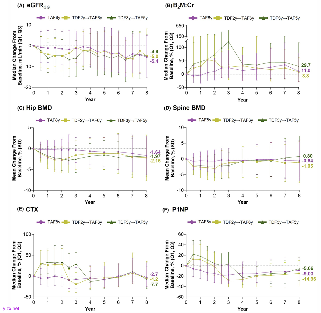 在1298名随机分组的患者中,有775名初始接受TAF治疗的患者和382名初始接受TDF治疗的患者完成了开放标签阶段的随访。其中,有180名和202名患者分别在第2年和第3年从TDF转换为TAF治疗。在第8年的终点数据中,TAF组、TDF转TAF(2年后转换)组以及TDF转TAF(3年后转换)组的HBV DNA低于29 IU/mL的比例分别为69%、66%和73%(基于“缺失等于失败”分析)。如果采用“缺失等于排除”分析,则比例分别为95%、94%和97%,表明TAF在长期治疗中具有高度的病毒学抑制效果。关于安全性和耐受性方面,接受双盲/开放标签TAF治疗的患者在肾小球滤过率(eGFRCG,Cockcroft-Gault法计算)和髋部/脊柱骨密度(BMD)方面表现稳定,仅有轻微下降。相比之下,初始接受TDF治疗的患者在双盲阶段期间出现eGFRCG和BMD下降,但在转换为TAF后这些指标得到改善。此外,研究未发现任何患者对TAF产生耐药性突变。