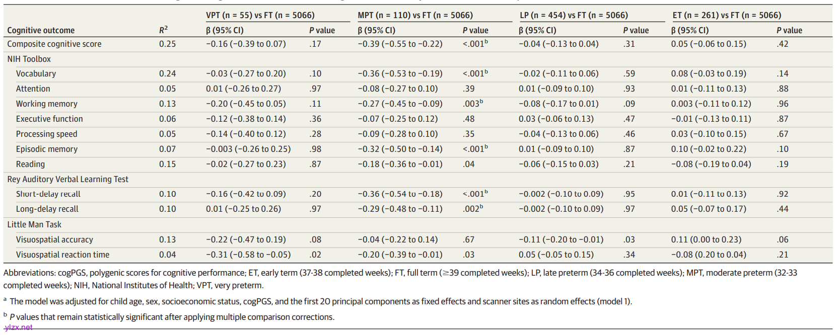 中度早产儿童在语言(β=-0.36)、工作记忆(β=-0.27)、情景记忆(β=-0.32)及短时(β=-0.36)/长时回忆(β=-0.29)得分均显著降低(P<0.005),视觉空间反应时延长但未达显著性(β=-0.22,P=0.08)。极早产组仅视觉空间反应时显著受损(β=-0.31,P=0.02)。