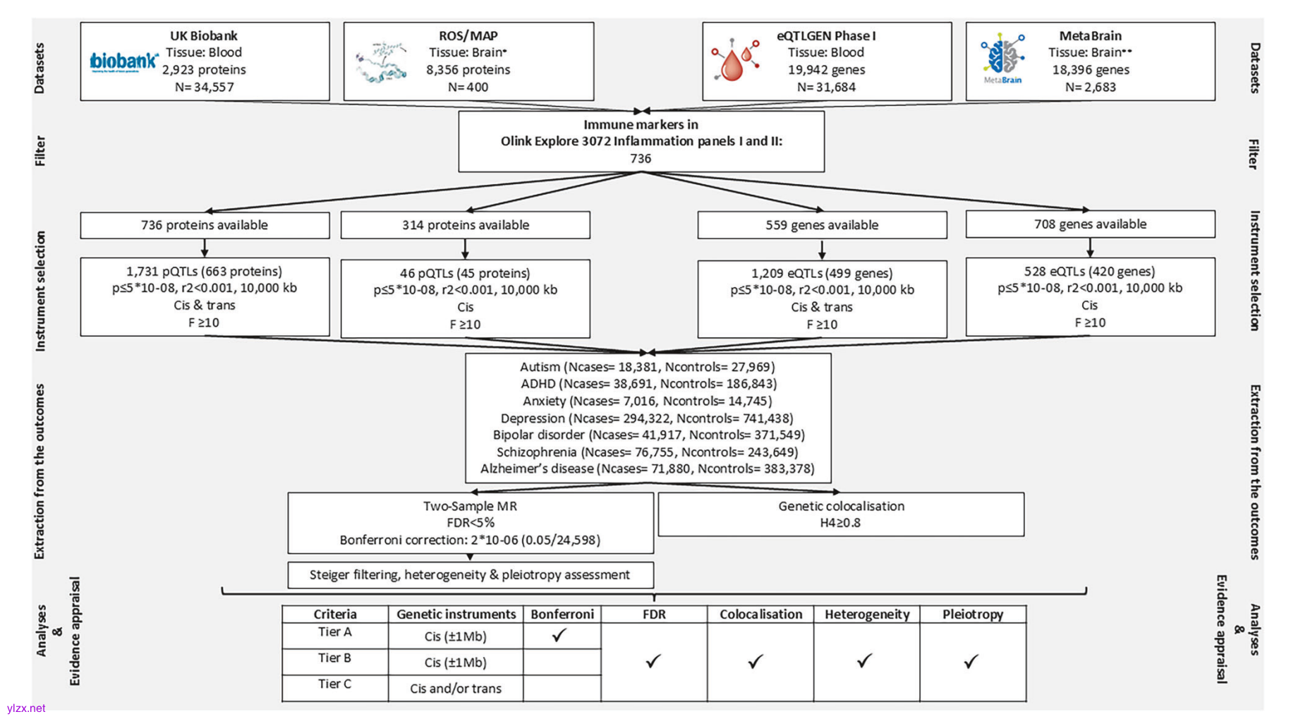 图1:评估神经精神疾病潜在因果免疫生物标志物的分析流程及证据评价方法