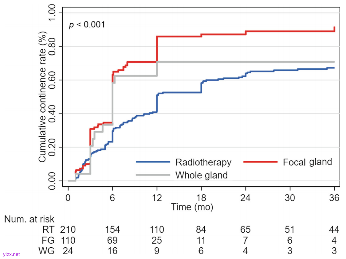 结果显示,RT、FG消融和WG消融的中位(四分位间距)随访期分别为38(19-73)个月、20(10-37)个月和24(16-38)个月(p<0.001)。仅4例患者(1%)出现术中并发症,术后<2%的患者出现Clavien分级≥3的并发症。RT、FG消融和WG消融的5年生化复发累积发生率分别为35%、45%和23%(p=0.3)。RT、FG消融和WG消融的3年尿控率累积发生率分别为67%、92%和71%(p<0.001)。RT、FG消融和WG消融的5年勃起功能恢复率累积发生率分别为16%、11%和5.3%(p=0.2),而5年总生存率分别为95%、94%和100%(p=0.7)。