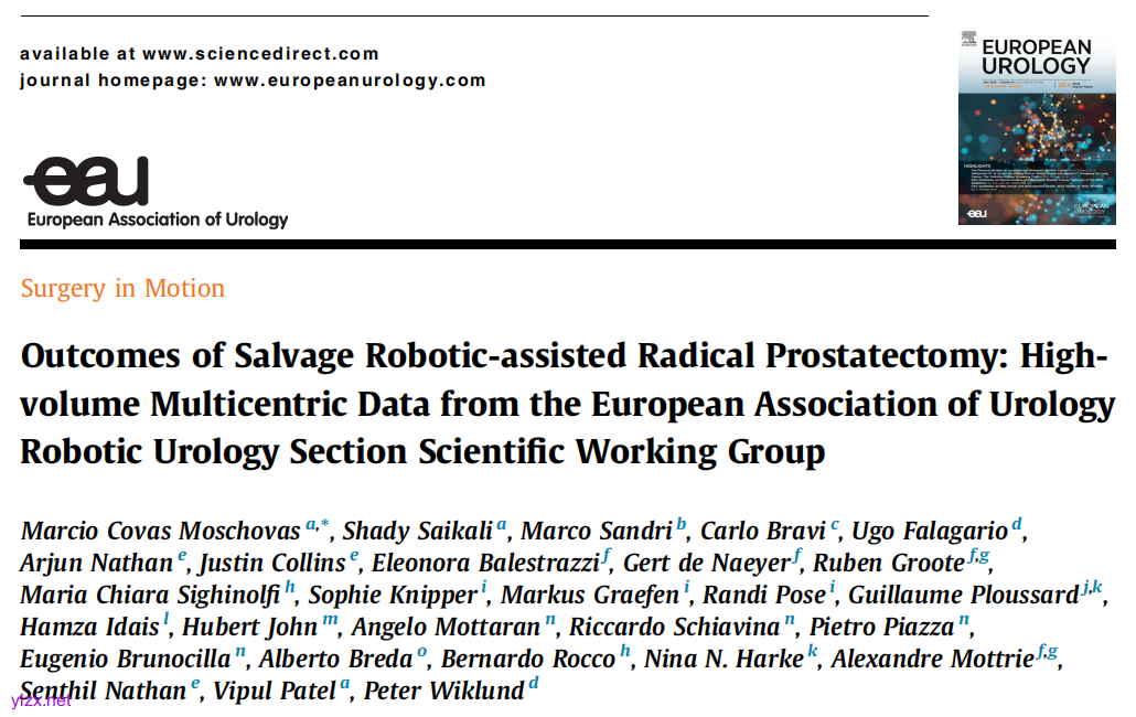 Covas Moschovas M, Saikali S, Sandri M, Bravi C, Falagario U, Nathan A, Collins J, Balestrazzi E, de Naeyer G, Groote R, Chiara Sighinolfi M, Knipper S, Graefen M, Pose R, Ploussard G, Idais H, John H, Mottaran A, Schiavina R, Piazza P, Brunocilla E, Breda A, Rocco B, Harke NN, Mottrie A, Nathan S, Patel V, Wiklund P. Outcomes of Salvage Robotic-assisted Radical Prostatectomy: High-volume Multicentric Data from the European Association of Urology Robotic Urology Section Scientific Working Group. Eur Urol. 2025 Apr 9:S0302-2838(25)00180-0. doi: 10.1016/j.eururo.2025.03.009. Epub ahead of print. PMID: 40210552.