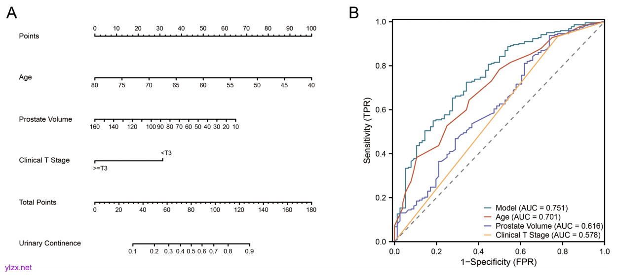 A. 不同前列腺体积下即刻尿控率的列线图模型 B. 本研究关于即刻尿控率的受试者工作特征(ROC)曲线