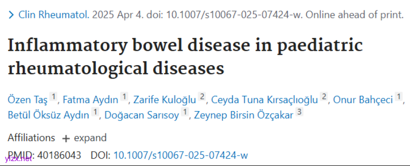 Taş Ö, Aydın F, Kuloğlu Z, Kırsaçlıoğlu CT, Bahçeci O, Aydın BÖ, Sarısoy D, Özçakar ZB. Inflammatory bowel disease in paediatric rheumatological diseases. Clin Rheumatol. 2025 Apr 4. doi: 10.1007/s10067-025-07424-w. Epub ahead of print. PMID: 40186043.
